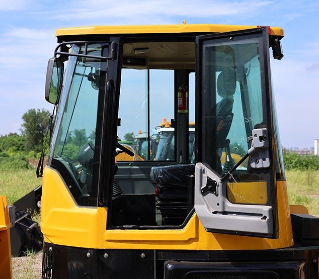 Cabina cerrada de la retroexcavadora RIPPA. La puerta de la cabina está abierta y los grandes ventanales de cristal ofrecen una visión clara, proporcionando protección y garantizando la seguridad y comodidad del operador.